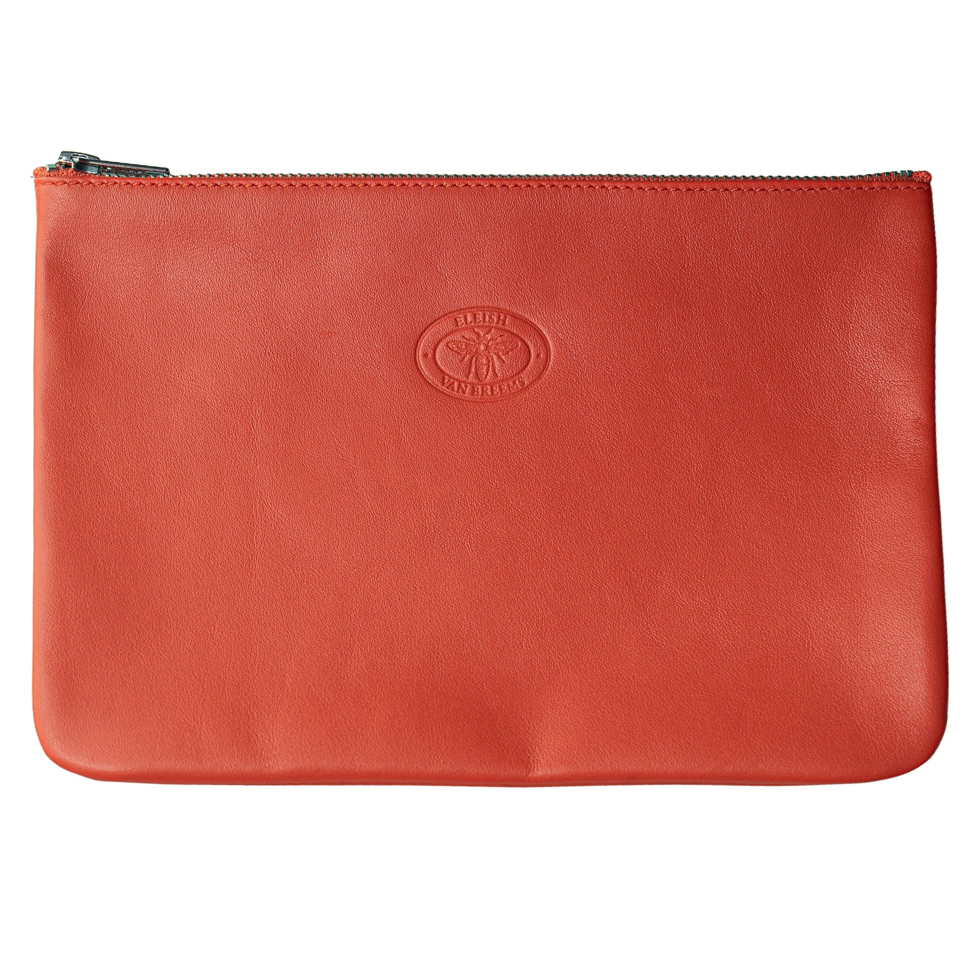 Exclusively ours, the Folly leather pouch or clutch in twelve bold colors with zipper closure is a great way to stay organized on the go.