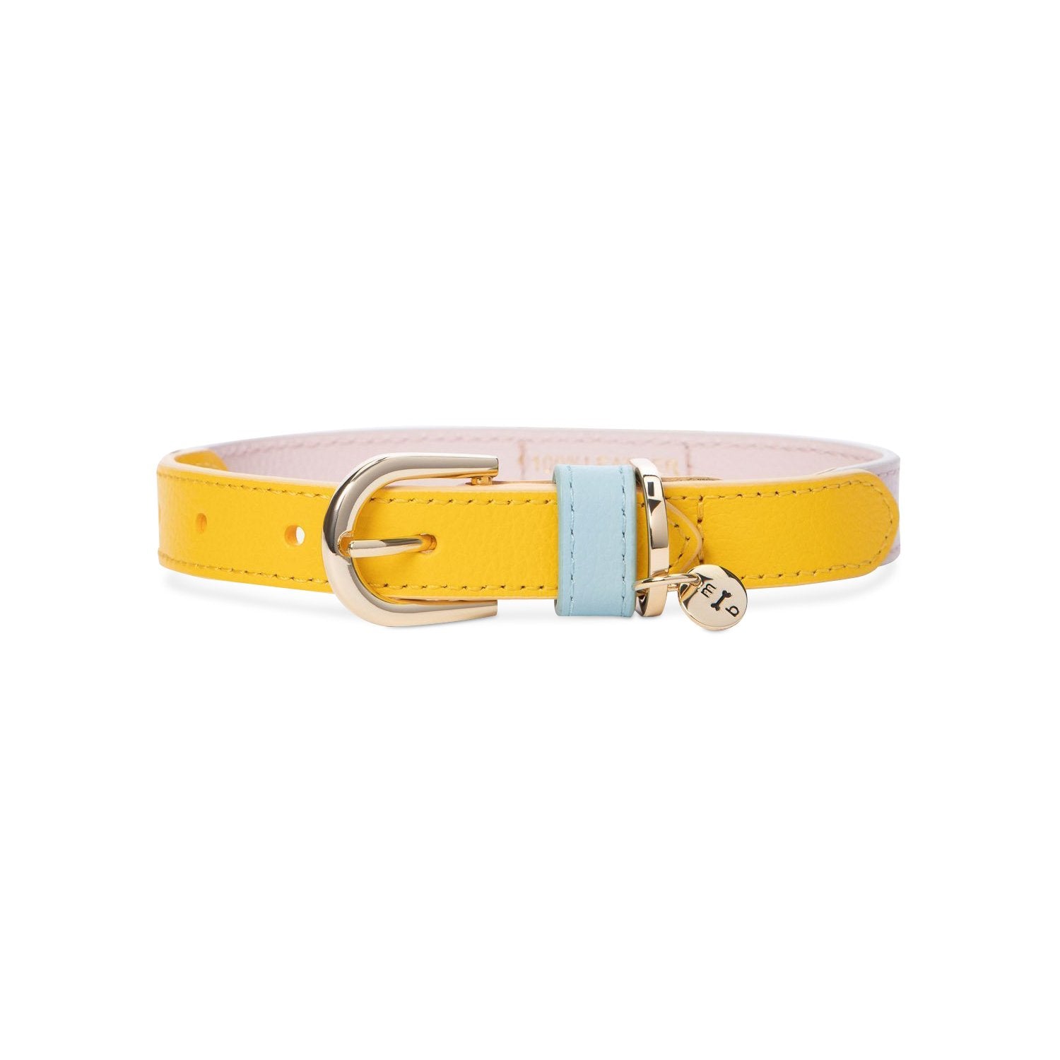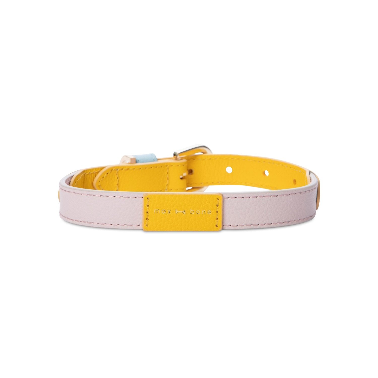 This best-selling, handmade and buttery-soft leather Isabel Collar features pink, burnt yellow and pale blue colors; complete with gold hardware.