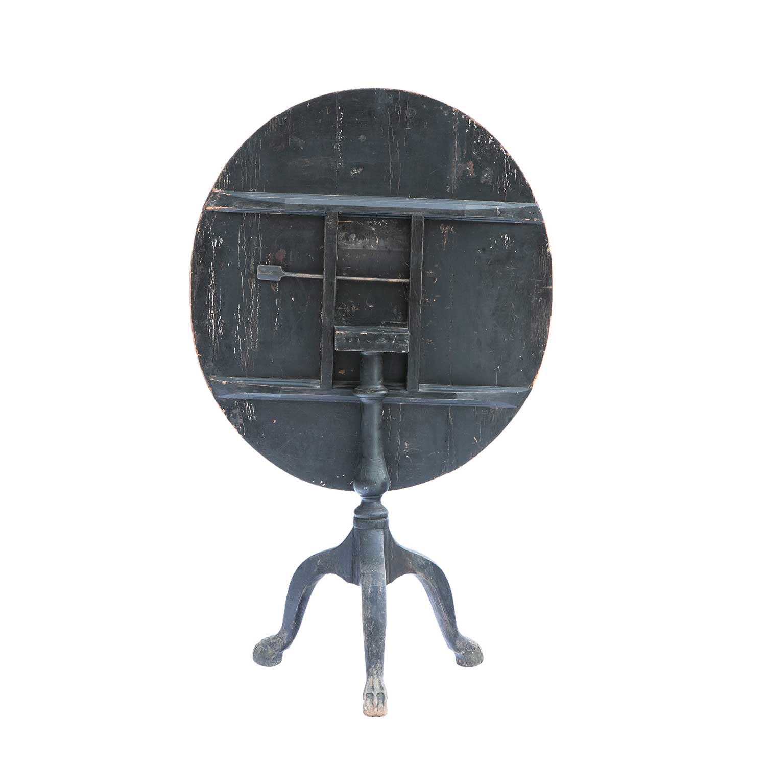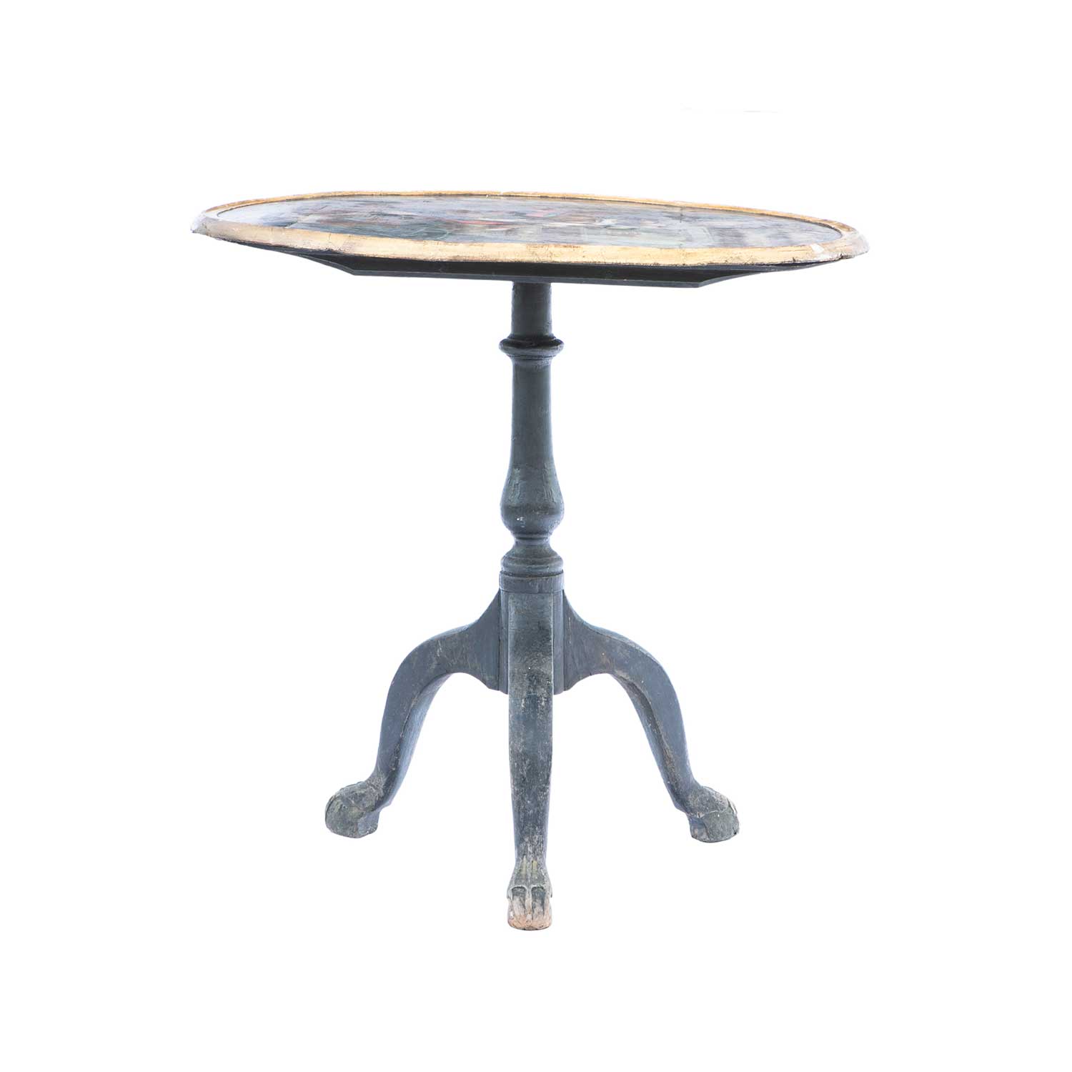 A tilt top table decoratively painted with a mythological scene of woman and her court in distress. Original claw feet. Rare. Swedish 1720-1740.