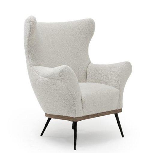 Paola Club Wing Chair Upholstered. Style 0502W. Exposed base with metal leg. Finish is sealed walnut on walnut.