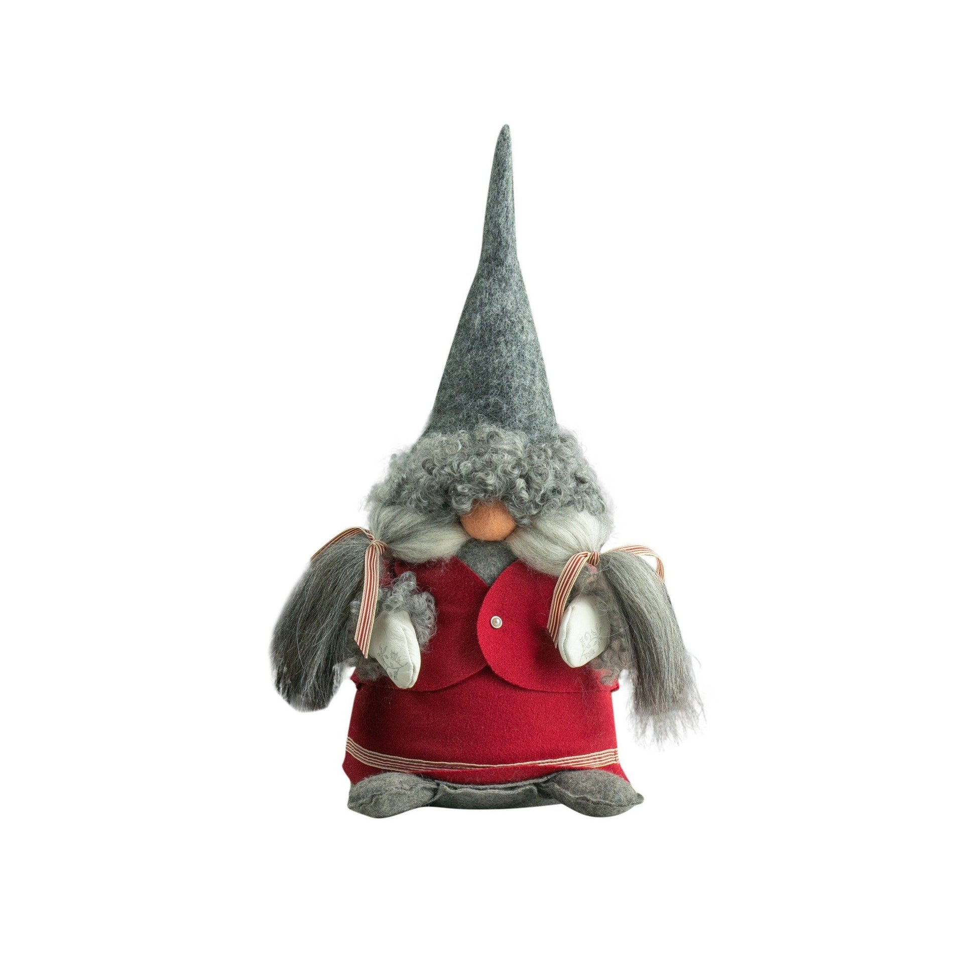 Sigrid is handcrafted in Sweden and has a tall grey cap and white leather gloves, both trimmed in signature Gotland sheepskin. Her hair is made of Icelandic sheepskin fur and tied into pigtails with festive red and white bows.