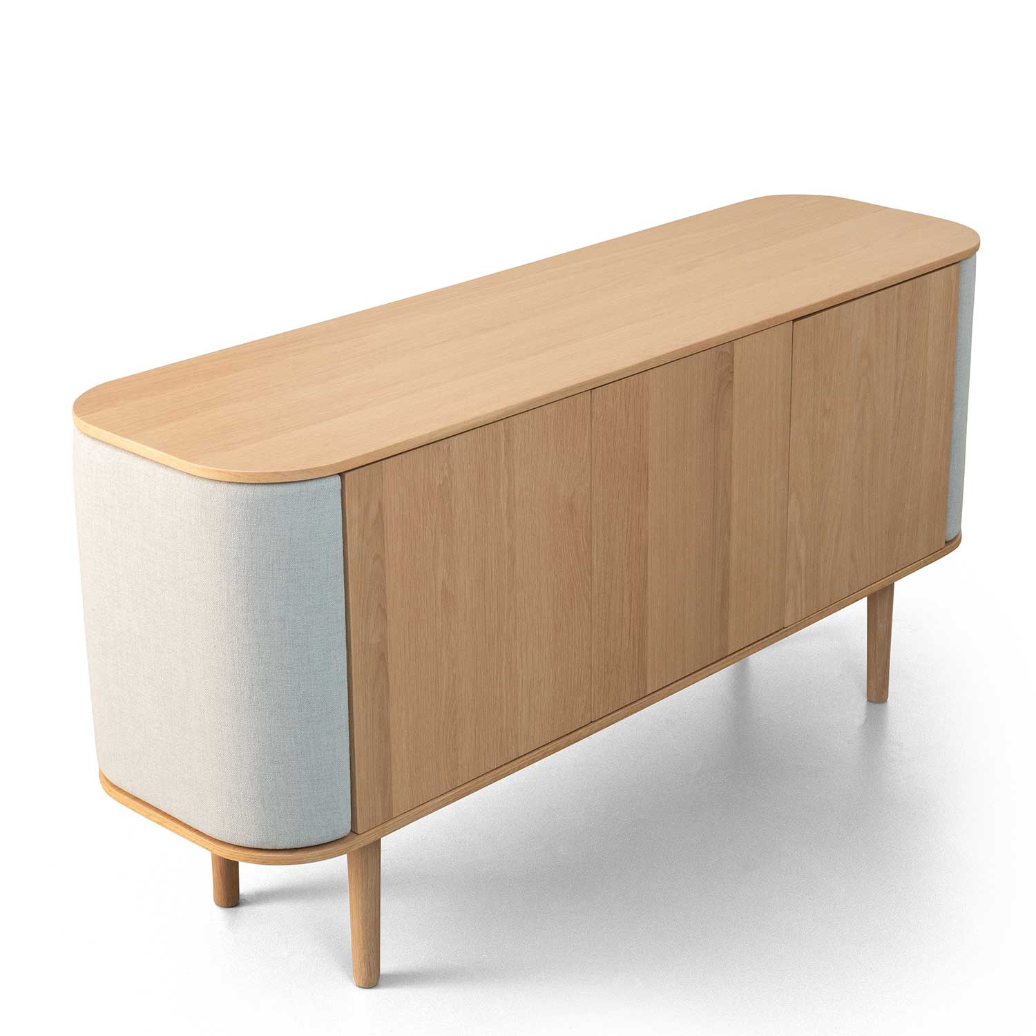 The Treasures Cabinet is made from veneered oak wood and the curved sides of the cabinet have a fabric covering that gives Treasures a soft tactile touch.