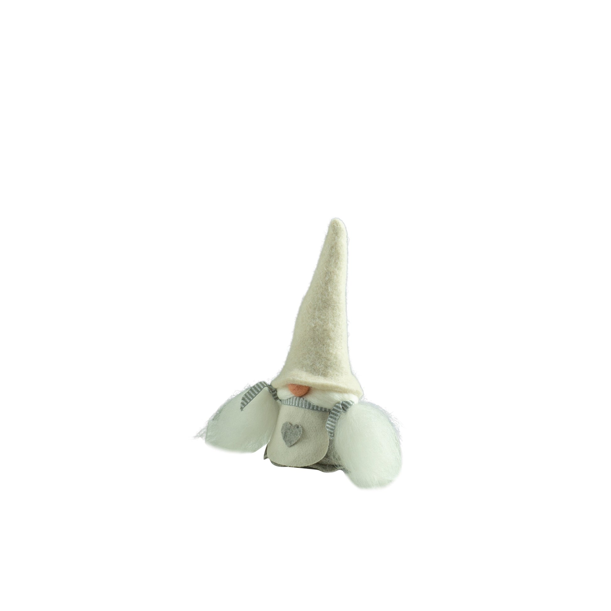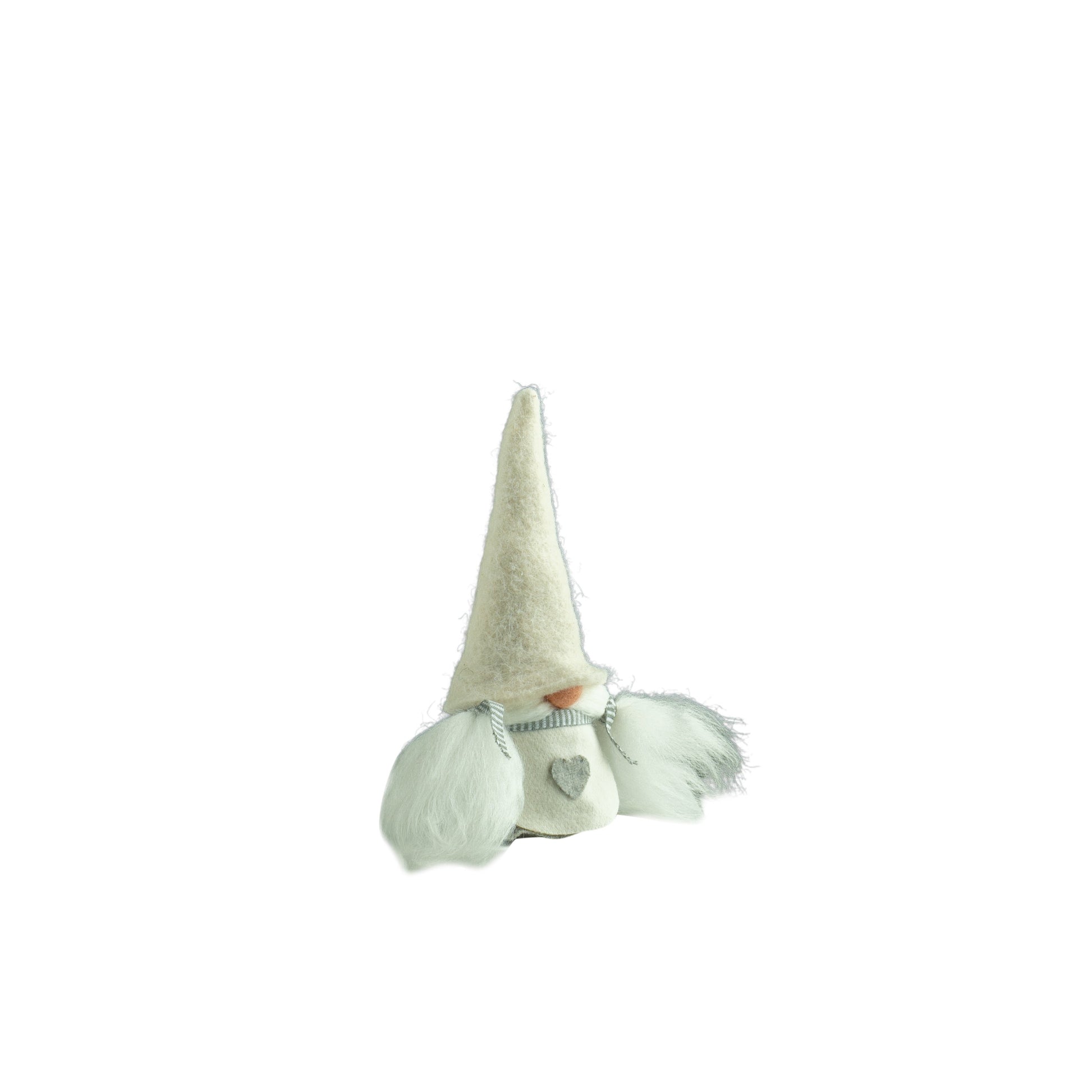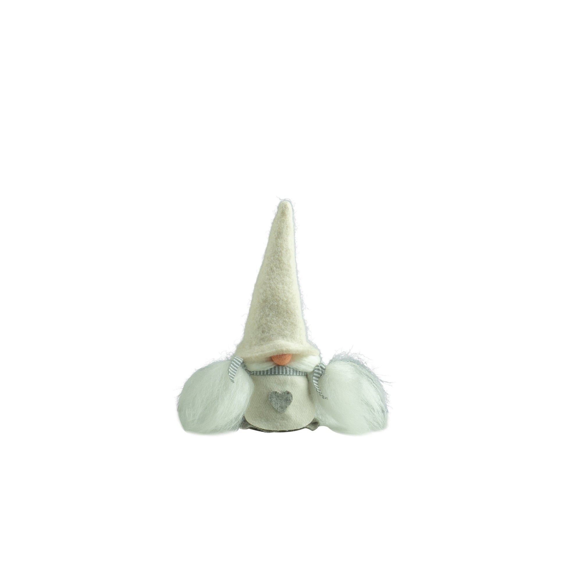 Viktoria is a sweet girl gnome with a heart smock, tall hat and sheep fur pigtails. Handcrafted in Sweden.